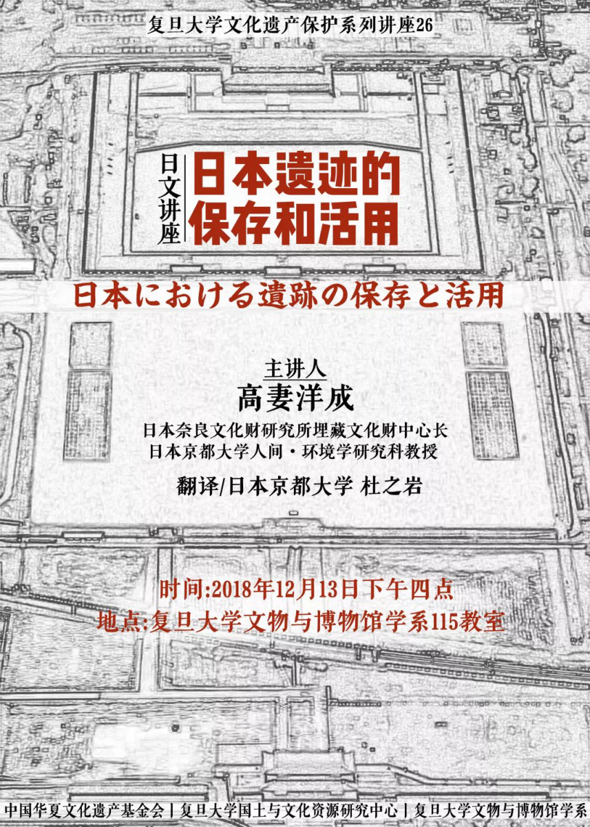 2018年12月13日,受复旦大学国土与文化资源研究中心的邀请,日本奈良文化财研究所埋藏文化财中心长高妻洋成在复旦大学文博系举办了一场精彩的关于“日本遗迹的保存与活用”的主题讲座